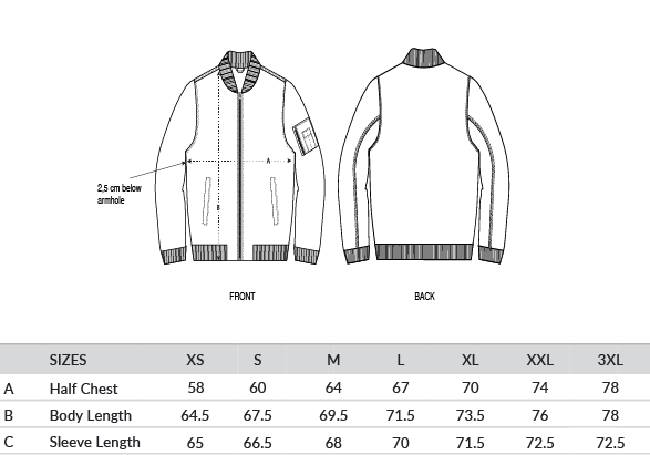 Silver metal zip at centre front. 1x1 rib at sleeve hem, bottom hem and collar. Zipped sleeve pocket with four pen slots. Welt pocket at front with snap closure. Inside fully quilted. Inside chest welt pocket with snap closure. Inside zip opening at bottom hem and wearer’s left and right chest for easy decoration.
